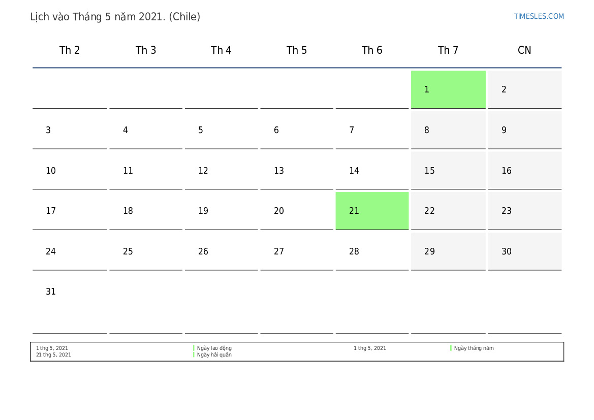 Tải xuống và in lịch PDF với các ngày lễ và cuối tuần vào Tháng 5 năm 2021 cho Chile