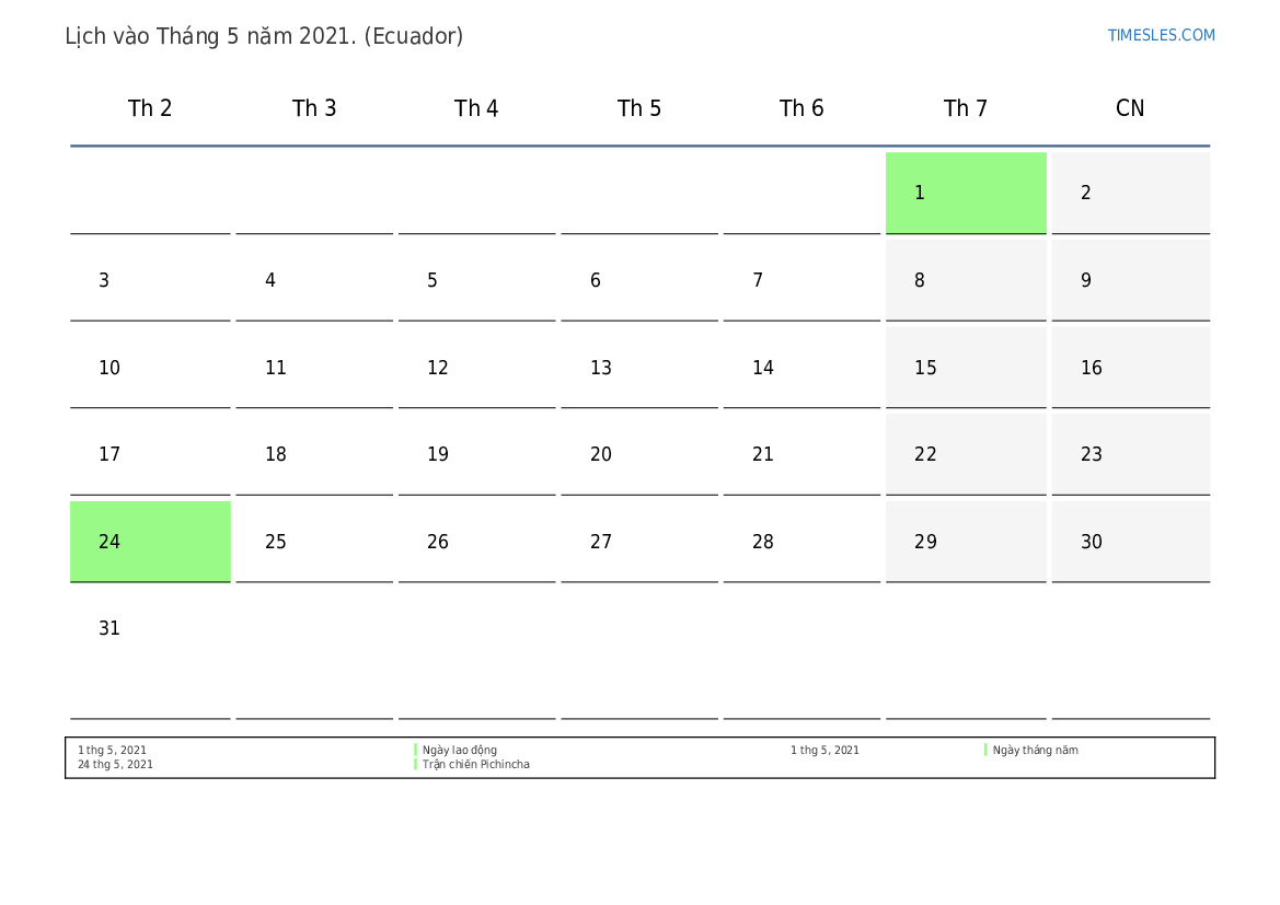 Tải xuống và in lịch PDF với các ngày lễ và cuối tuần vào Tháng 5 năm 2021 cho Ecuador
