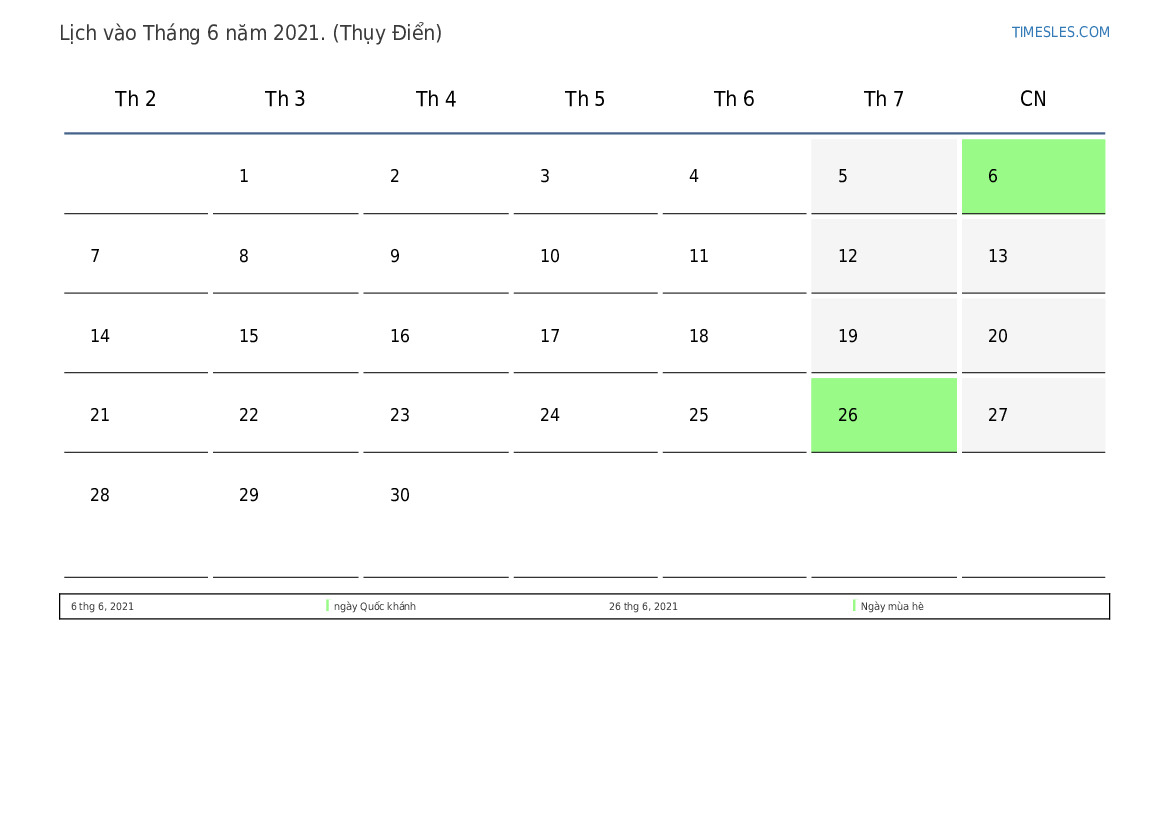Tháng 6 có 30 ngày. Đây là 6 tháng của năm 2021. Mùa trong năm: mùa hè. Tháng 6 bắt đầu vào thứ ba và kết thúc vào thứ Tư. Vào Tháng 6 năm 2021, có 4 ngày nghỉ và ngày nghỉ ở Thủy Điển.