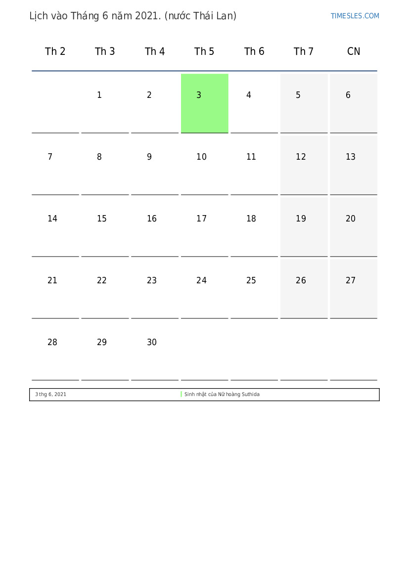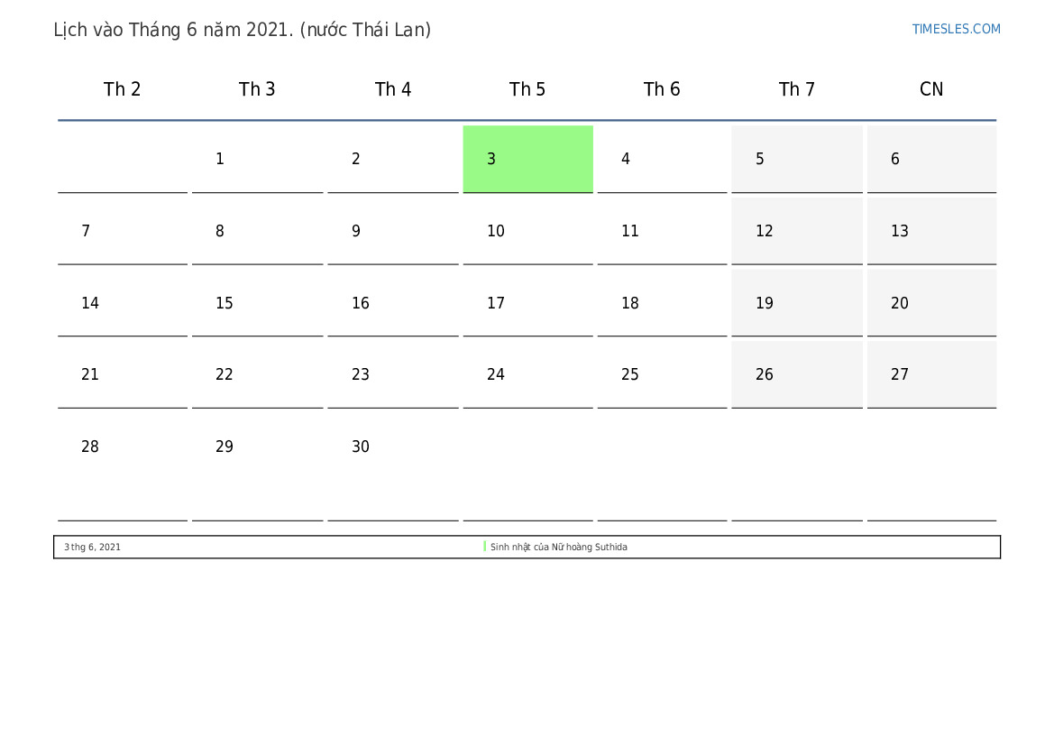 Tải xuống và in lịch PDF với các ngày lễ và cuối tuần vào Tháng 6 năm 2021 cho Thái Lan