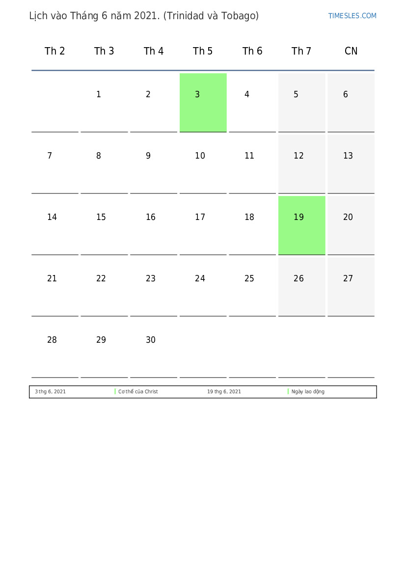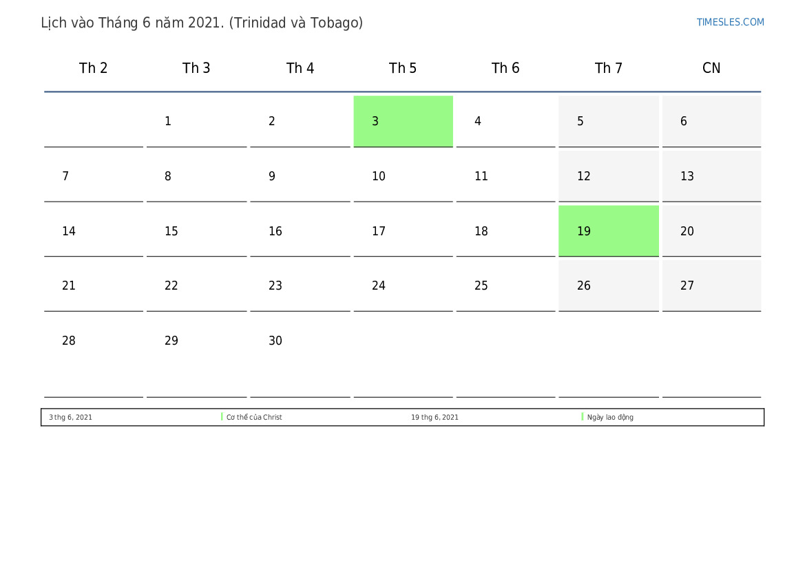 Tải xuống và in lịch PDF với các ngày lễ và cuối tuần vào Tháng 6 năm 2021 cho Trinidad và Tobago