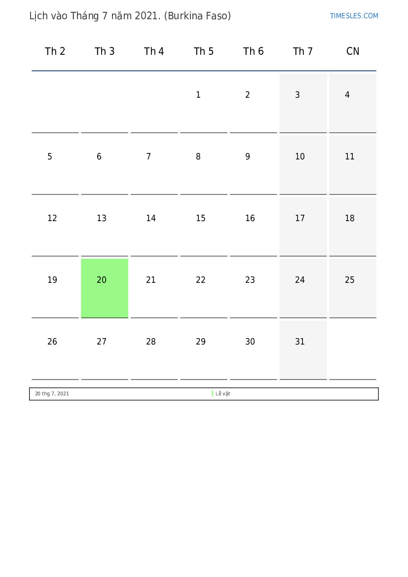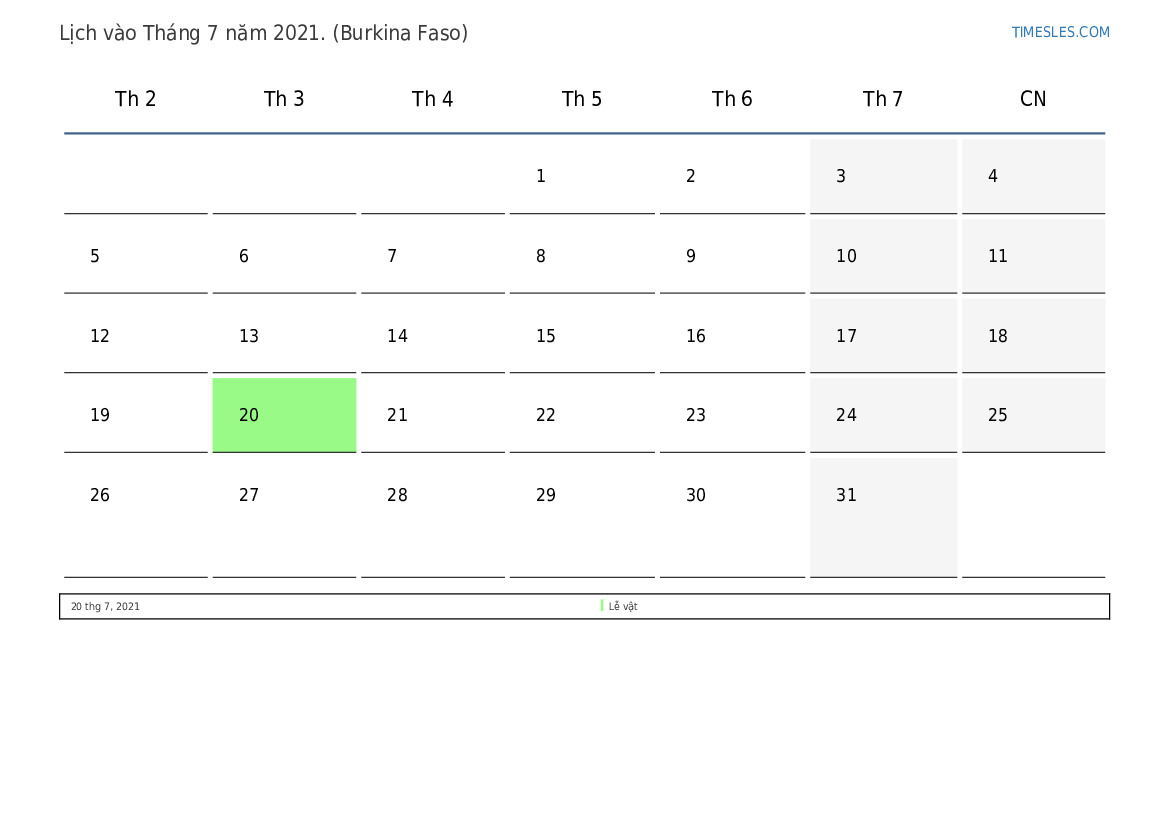Tải xuống và in lịch PDF với các ngày lễ và cuối tuần vào Tháng 7 năm 2021 cho Burkina Faso