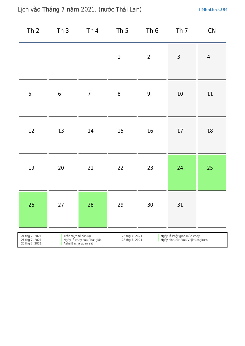 Tháng 7 năm 2021 theo lịch cho Thái Lan
