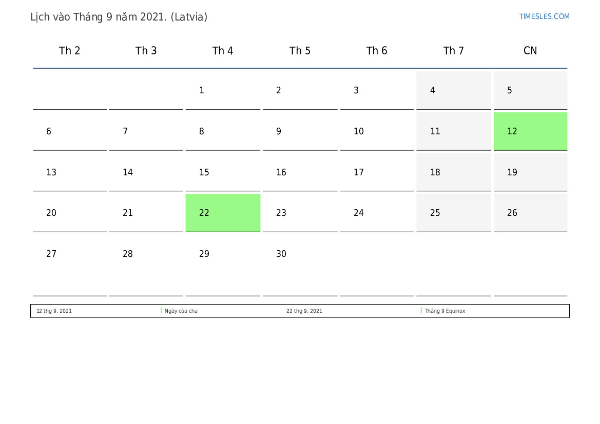 Lịch nghỉ lễ và cuối tuần vào Tháng 9 năm 2021 cho Latvia