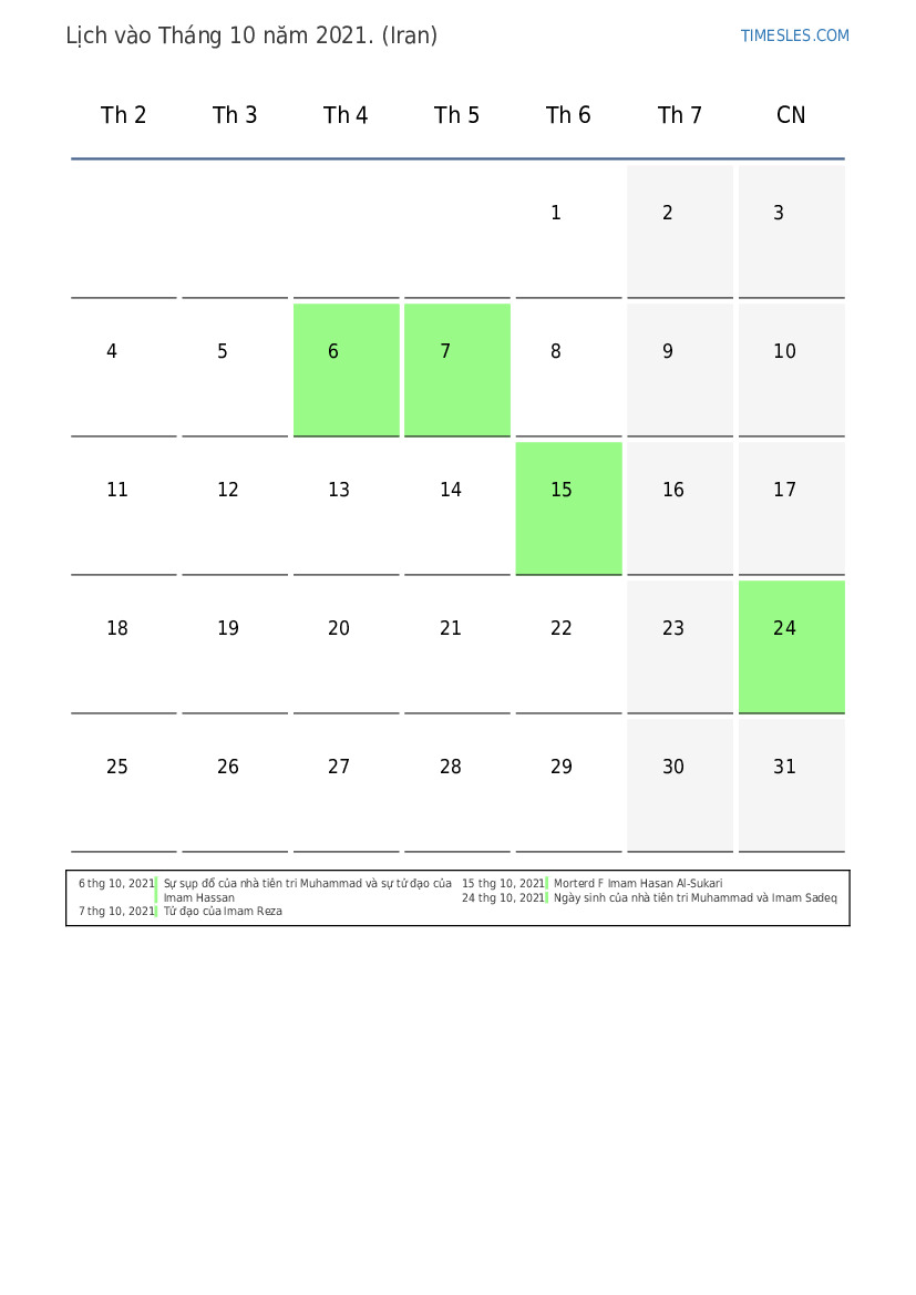 Lịch nghỉ lễ và cuối tuần vào Tháng 10 năm 2021 cho Iran