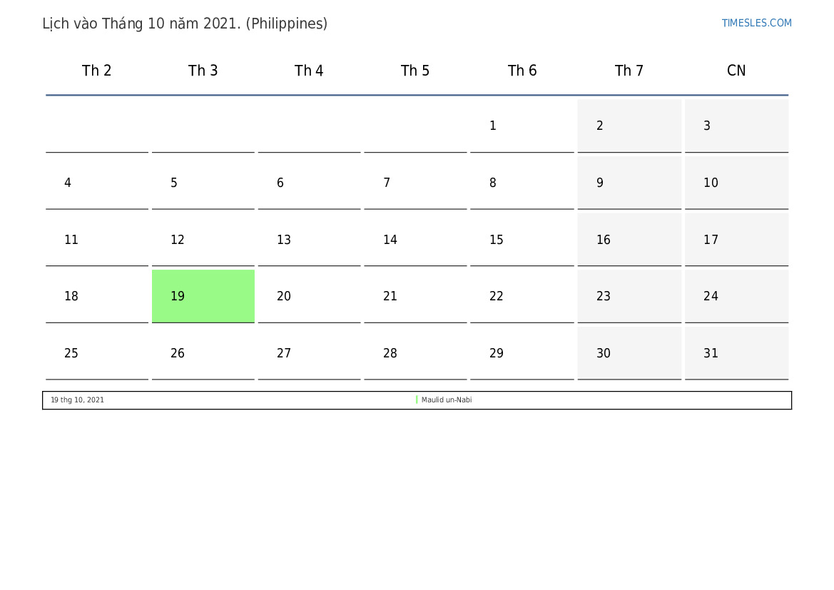 Tải xuống và in lịch PDF với các ngày lễ và cuối tuần vào Tháng 10 năm 2021 cho Philippines