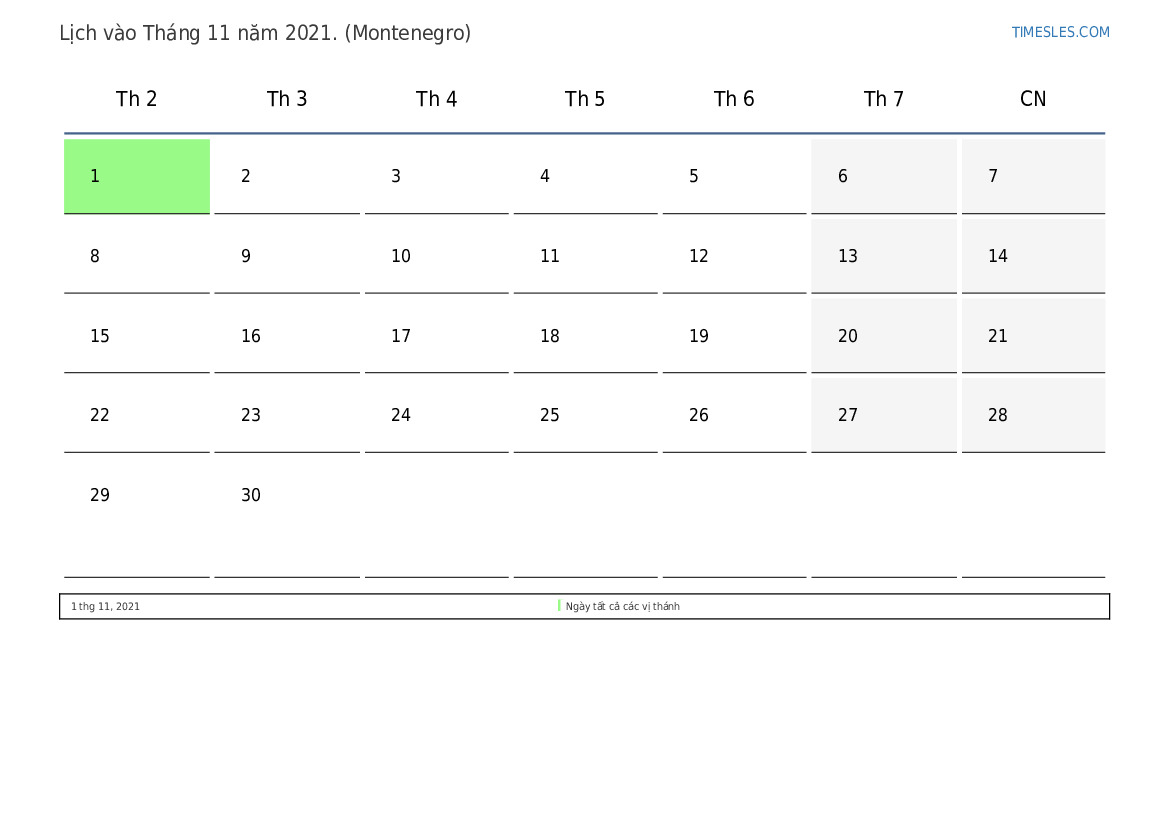 Tải xuống và in lịch PDF với các ngày lễ và cuối tuần vào Tháng 11 năm 2021 cho Montenegro