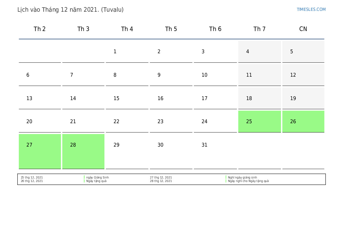 Lịch nghỉ lễ và cuối tuần vào Tháng 12 năm 2021 cho Tuvalu