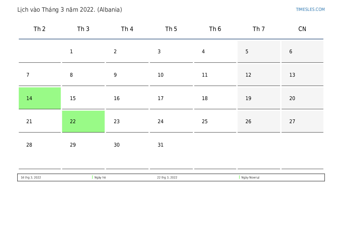 Tải xuống và in lịch PDF với các ngày lễ và cuối tuần vào Tháng 3 năm 2022 cho Albania