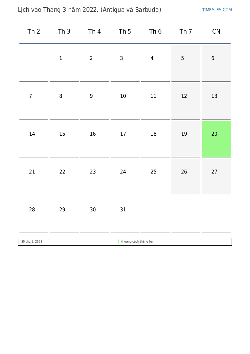 Tải xuống và in lịch PDF với các ngày lễ và cuối tuần vào Tháng 3 năm 2022 cho Antigua và Barbuda