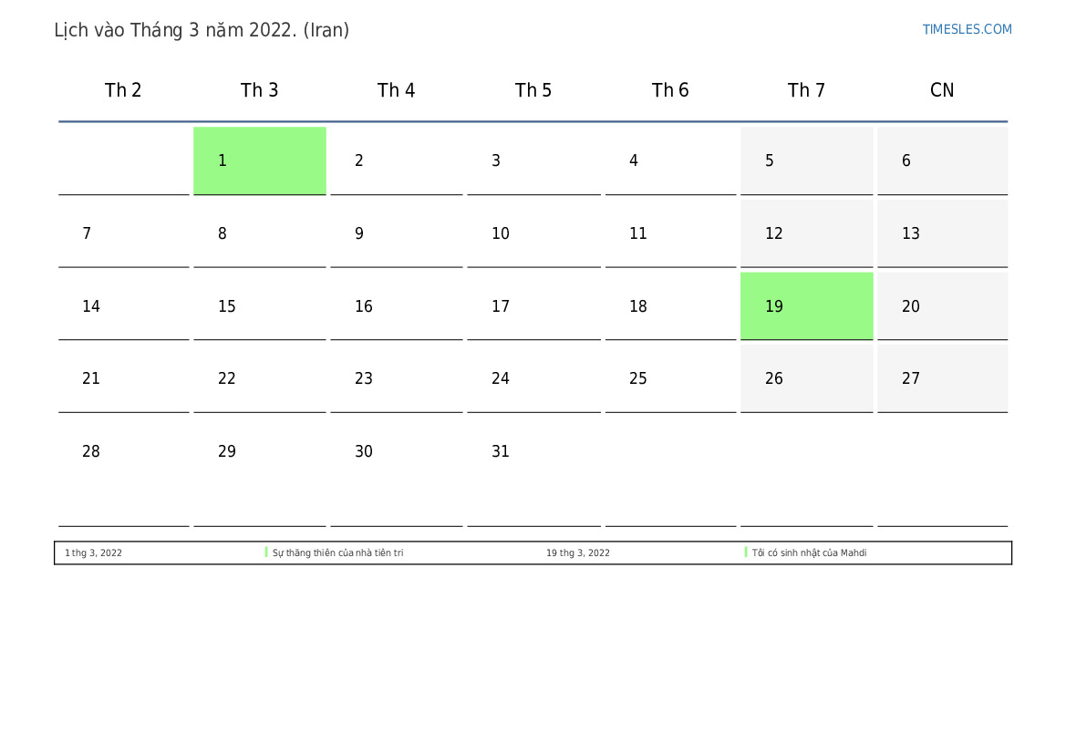 Lịch nghỉ lễ và cuối tuần vào Tháng 3 năm 2022 cho Iran