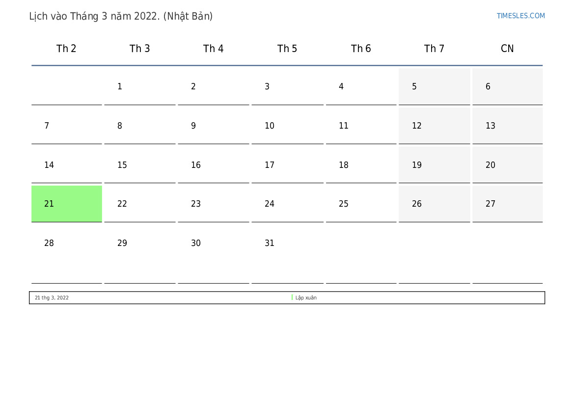 Tải xuống và in lịch PDF với các ngày lễ và cuối tuần vào Tháng 3 năm 2022 cho Nhật Bản