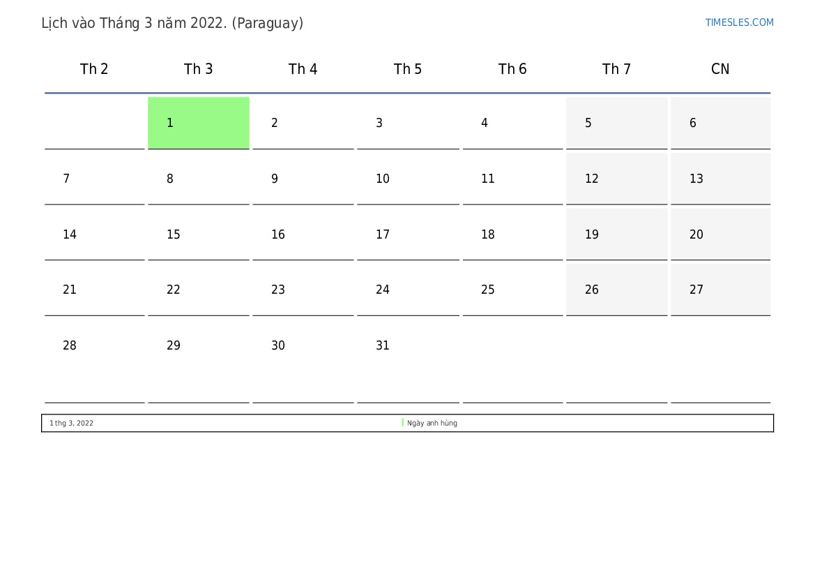 Tải xuống và in lịch PDF với các ngày lễ và cuối tuần vào Tháng 3 năm 2022 cho Paraguay