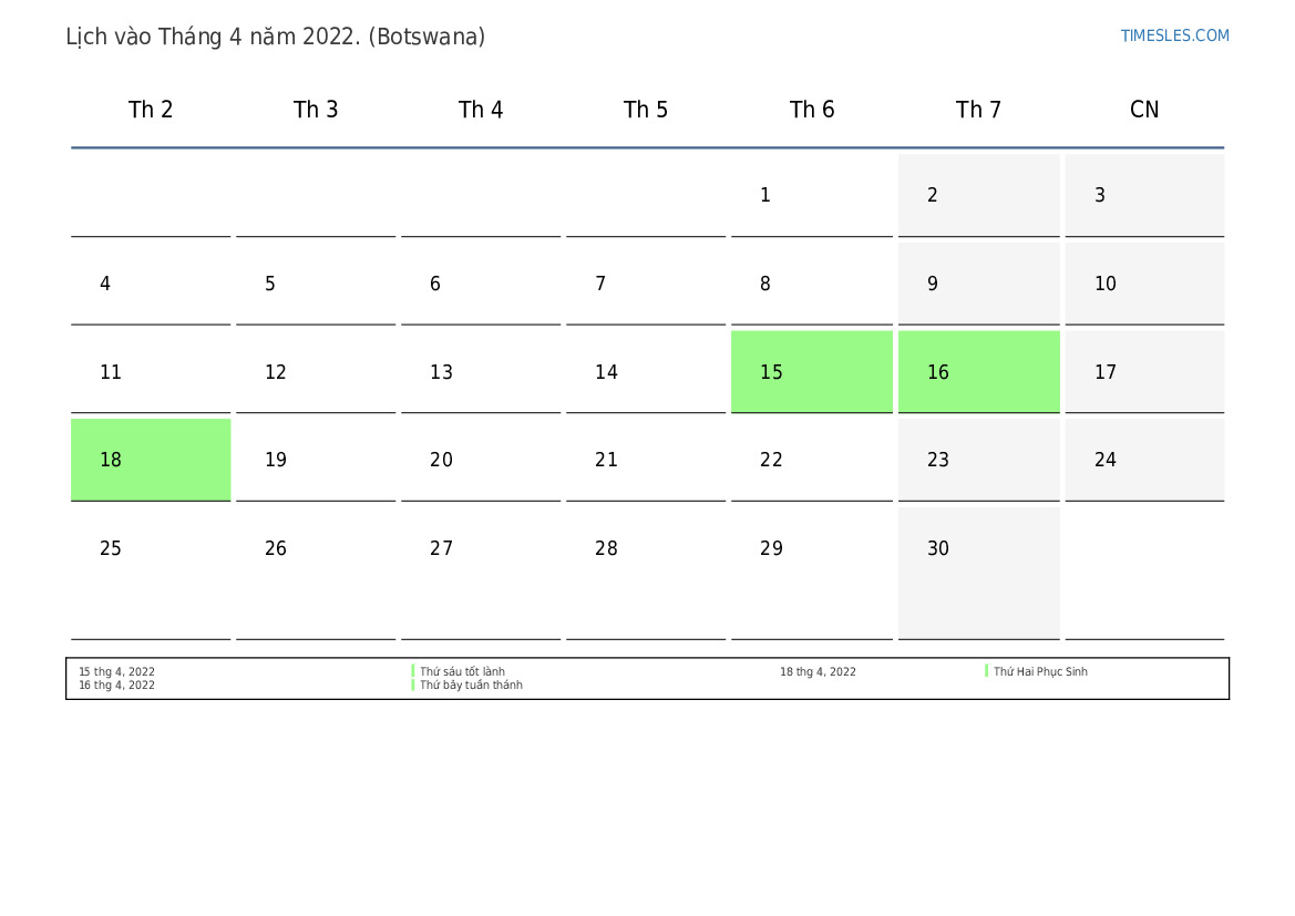 Tải xuống và in lịch PDF với các ngày lễ và cuối tuần vào Tháng 4 năm 2022 cho Botswana