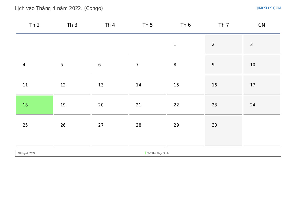 Tải xuống và in lịch PDF với các ngày lễ và cuối tuần vào Tháng 4 năm 2022 cho Congo