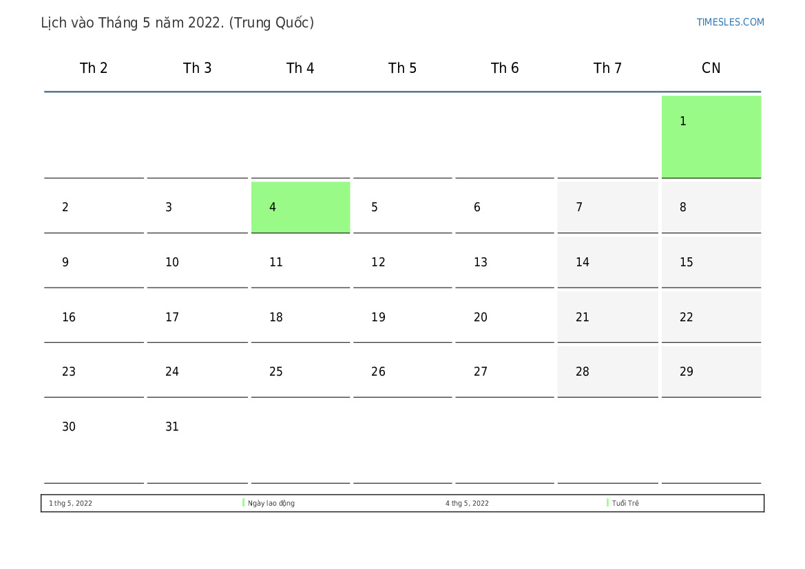 Lịch nghỉ lễ và cuối tuần vào Tháng 5 năm 2022 cho Trung Quốc