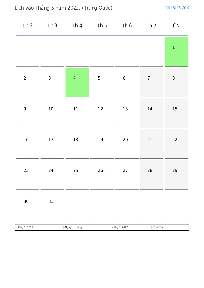 Tải xuống và in lịch PDF với các ngày lễ và cuối tuần vào Tháng 5 năm 2022 cho Trung Quốc