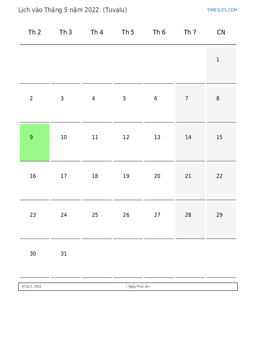 Tải xuống và in lịch PDF với các ngày lễ và cuối tuần vào Tháng 5 năm 2022 cho Tuvalu