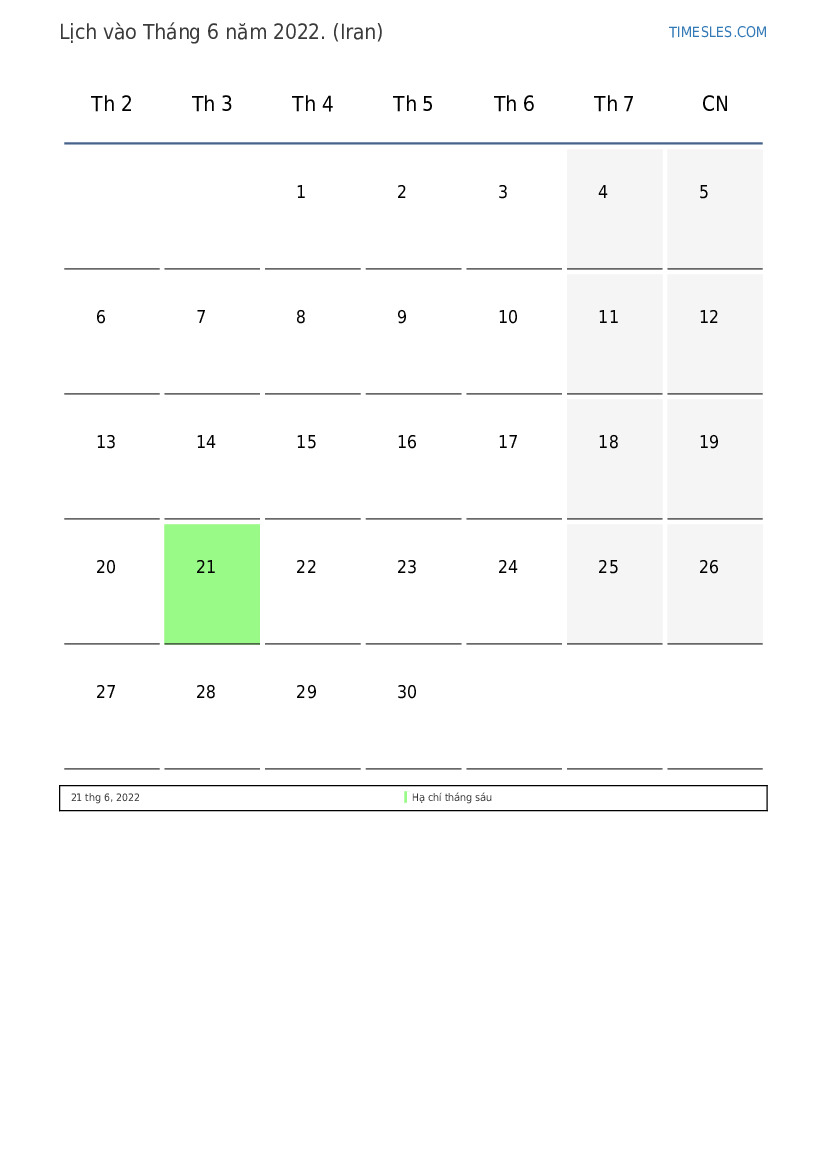 Tháng 6 có 30 ngày. Đây là 6 tháng của năm 2022. Mùa trong năm: mùa hè. Tháng 6 bắt đầu vào thứ Tư và kết thúc vào thứ Năm. Vào Tháng 6 năm 2022, có 1 ngày nghỉ và ngày nghỉ ở Iran.