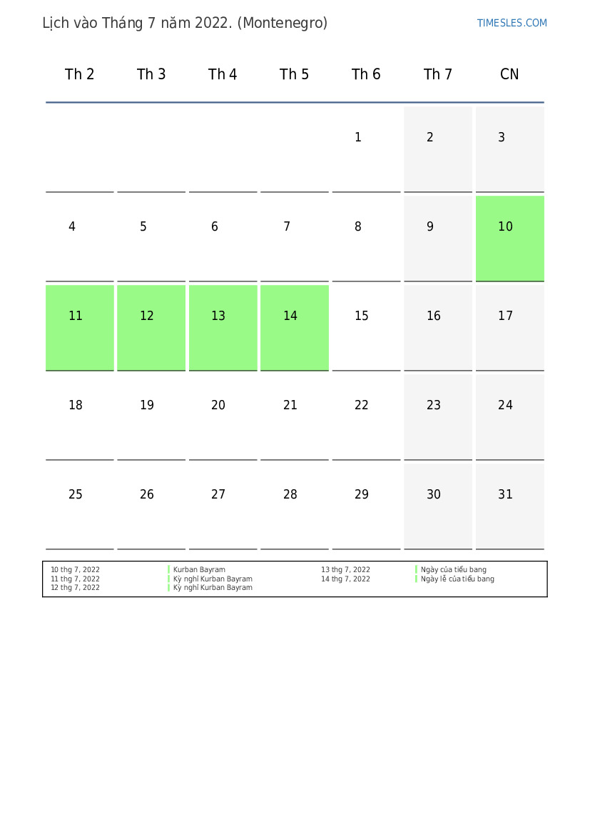 Lịch nghỉ lễ và cuối tuần vào Tháng 7 năm 2022 cho Montenegro