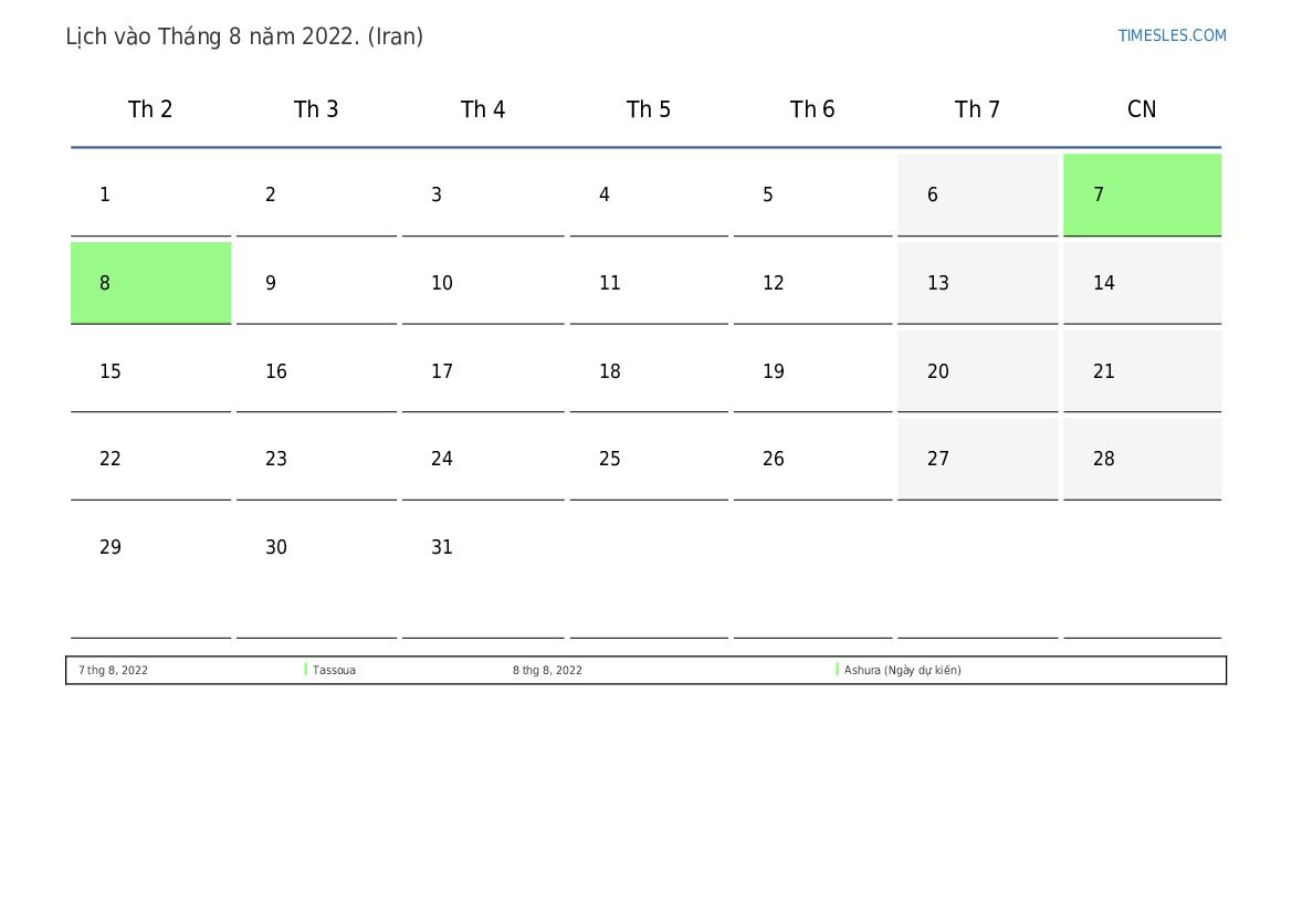 Tải xuống và in lịch PDF với các ngày lễ và cuối tuần vào Tháng 8 năm 2022 cho Iran