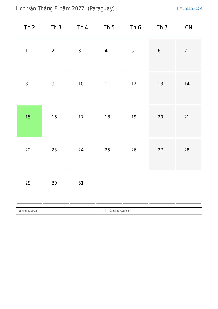 Tải xuống và in lịch PDF với các ngày lễ và cuối tuần vào Tháng 8 năm 2022 cho Paraguay