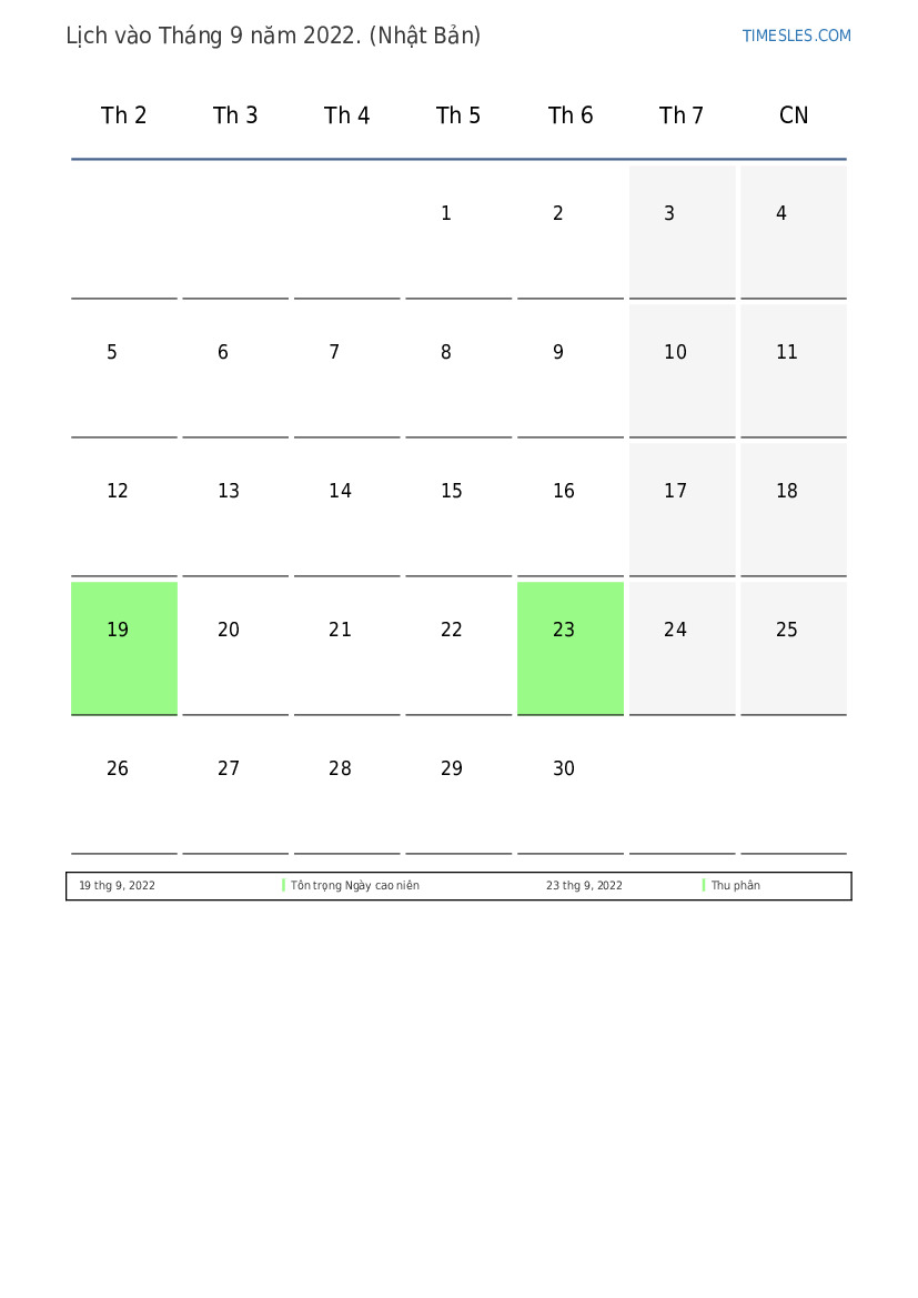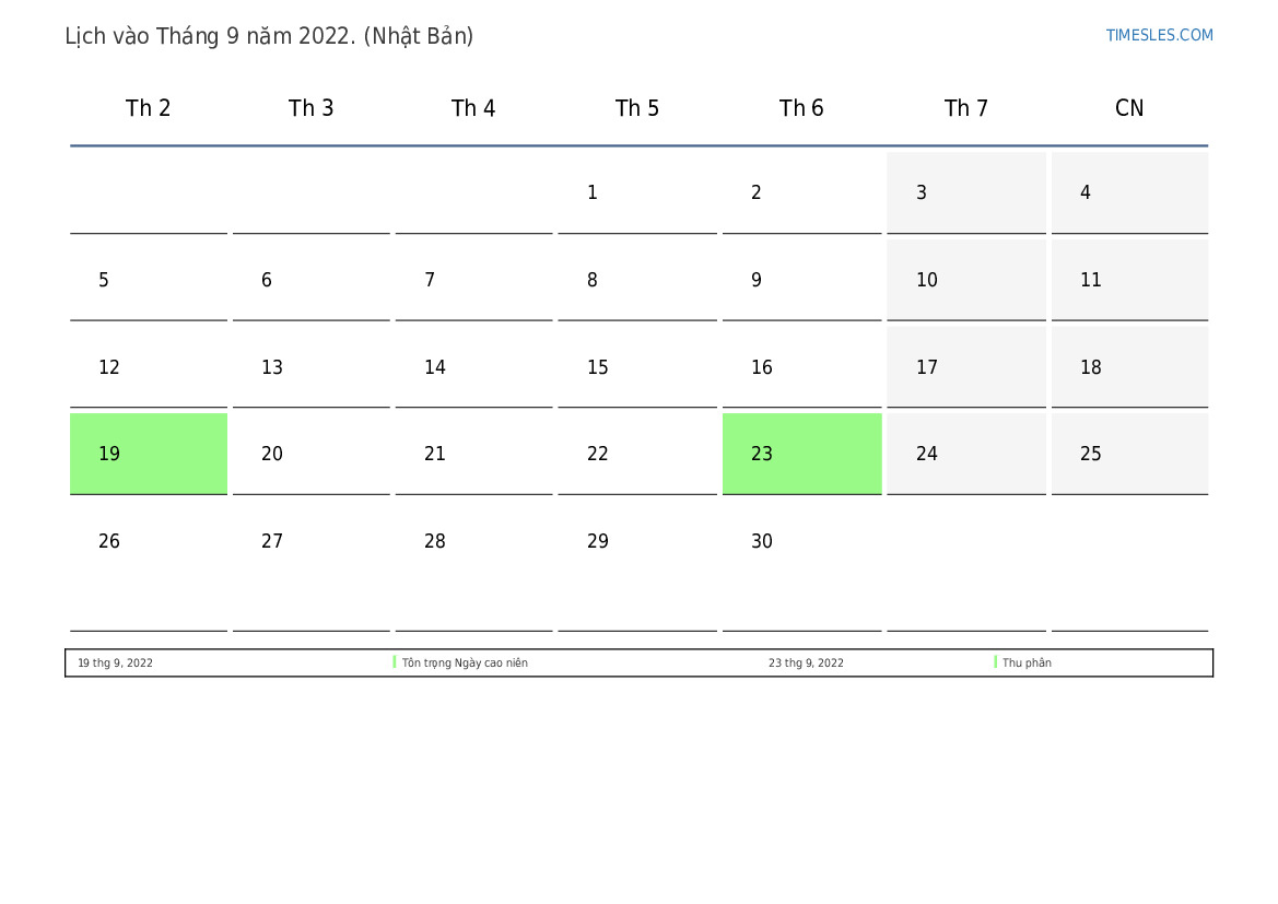 Tải xuống và in lịch PDF với các ngày lễ và cuối tuần vào Tháng 9 năm 2022 cho Nhật Bản