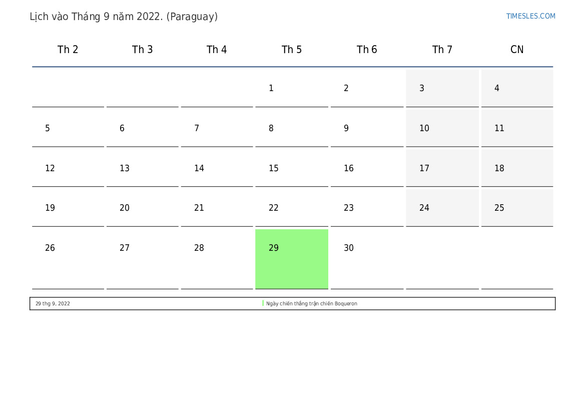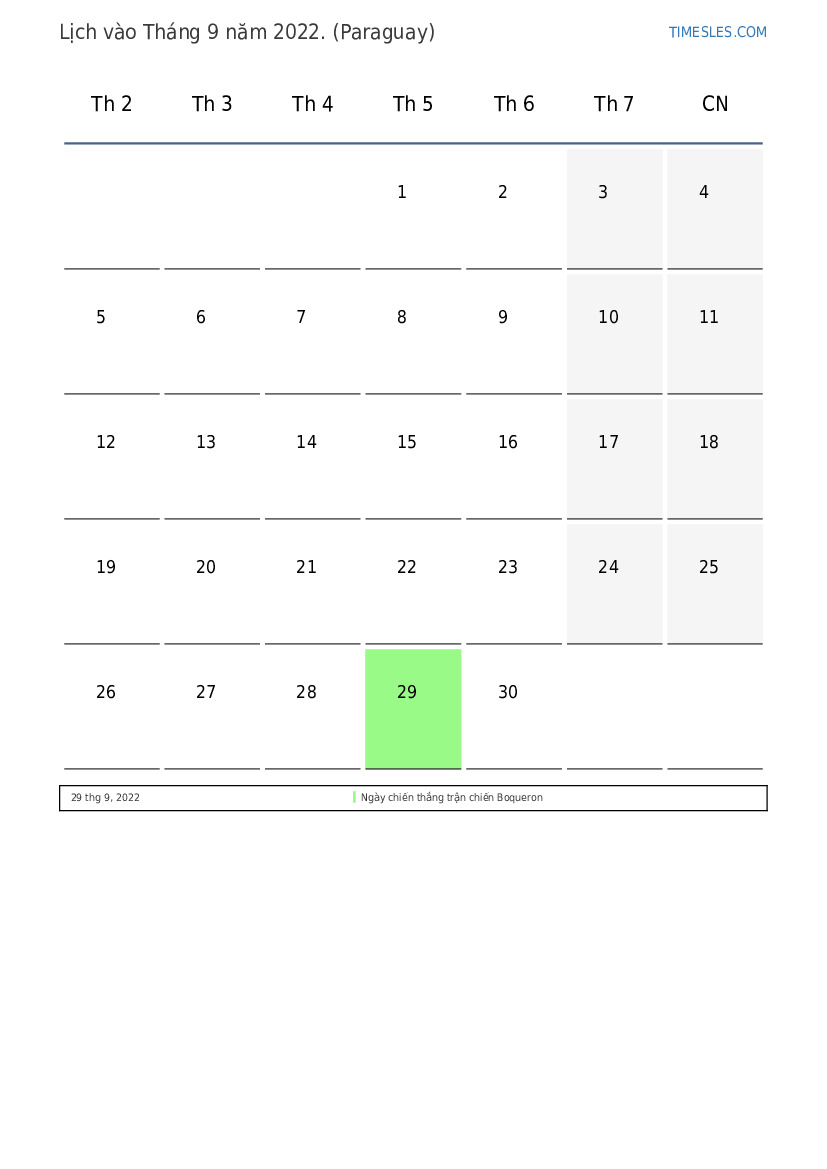 Tải xuống và in lịch PDF với các ngày lễ và cuối tuần vào Tháng 9 năm 2022 cho Paraguay