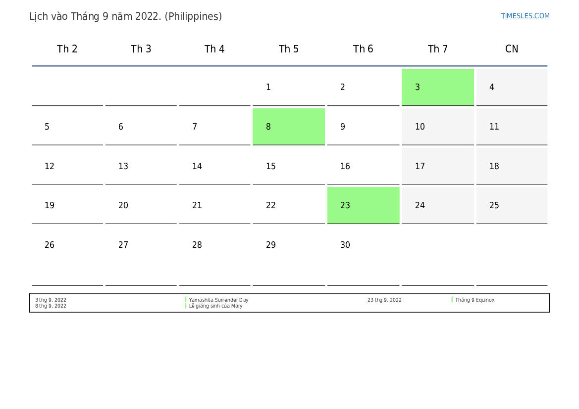 Tải xuống và in lịch PDF với các ngày lễ và cuối tuần vào Tháng 9 năm 2022 cho Philippines