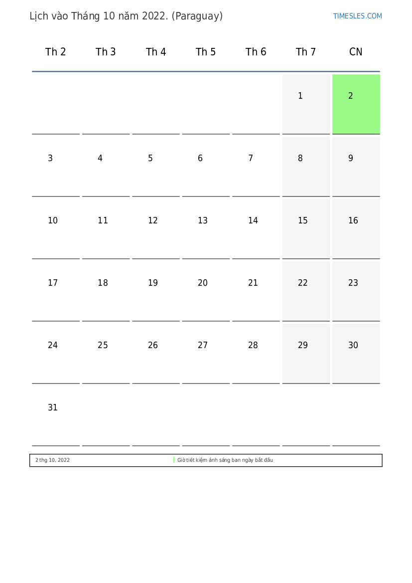 Tháng 10 năm 2022 theo lịch cho Paraguay