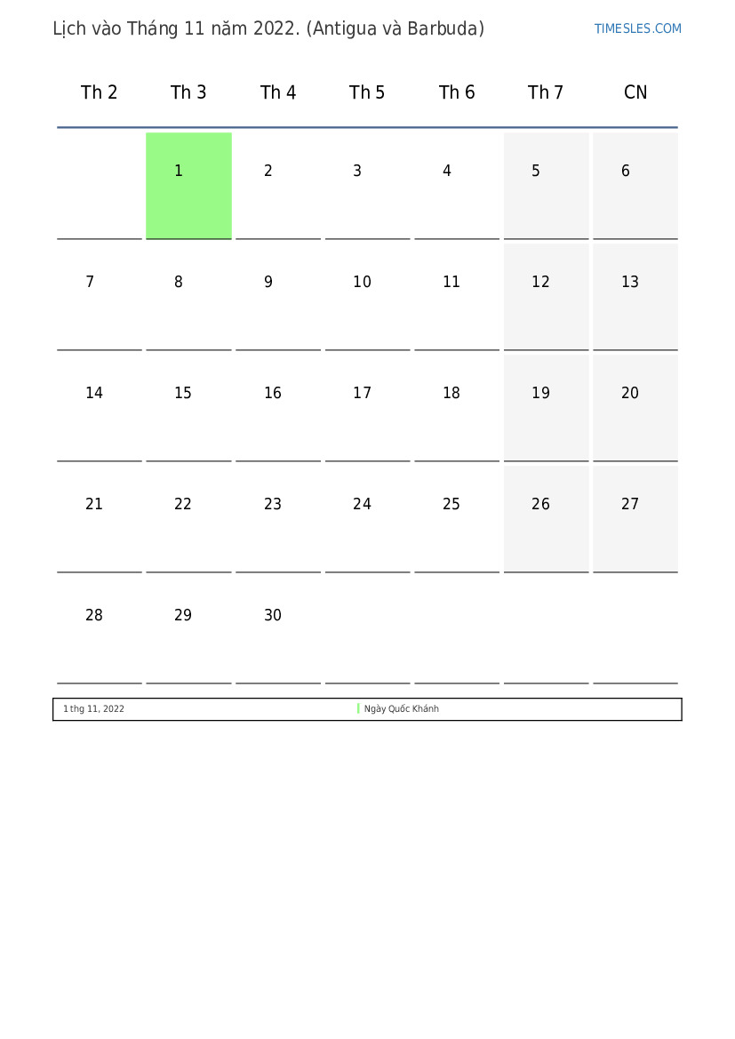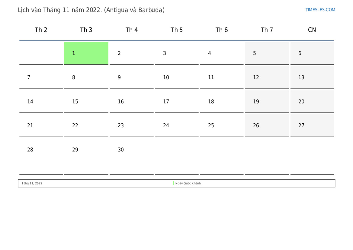 Tháng 11 năm 2022 theo lịch cho Antigua và Barbuda