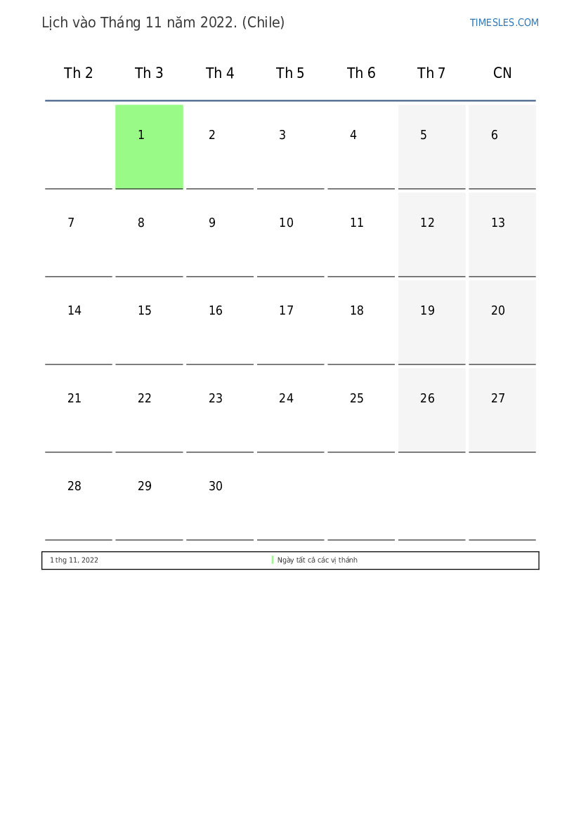 Tải xuống và in lịch PDF với các ngày lễ và cuối tuần vào Tháng 11 năm 2022 cho Chile