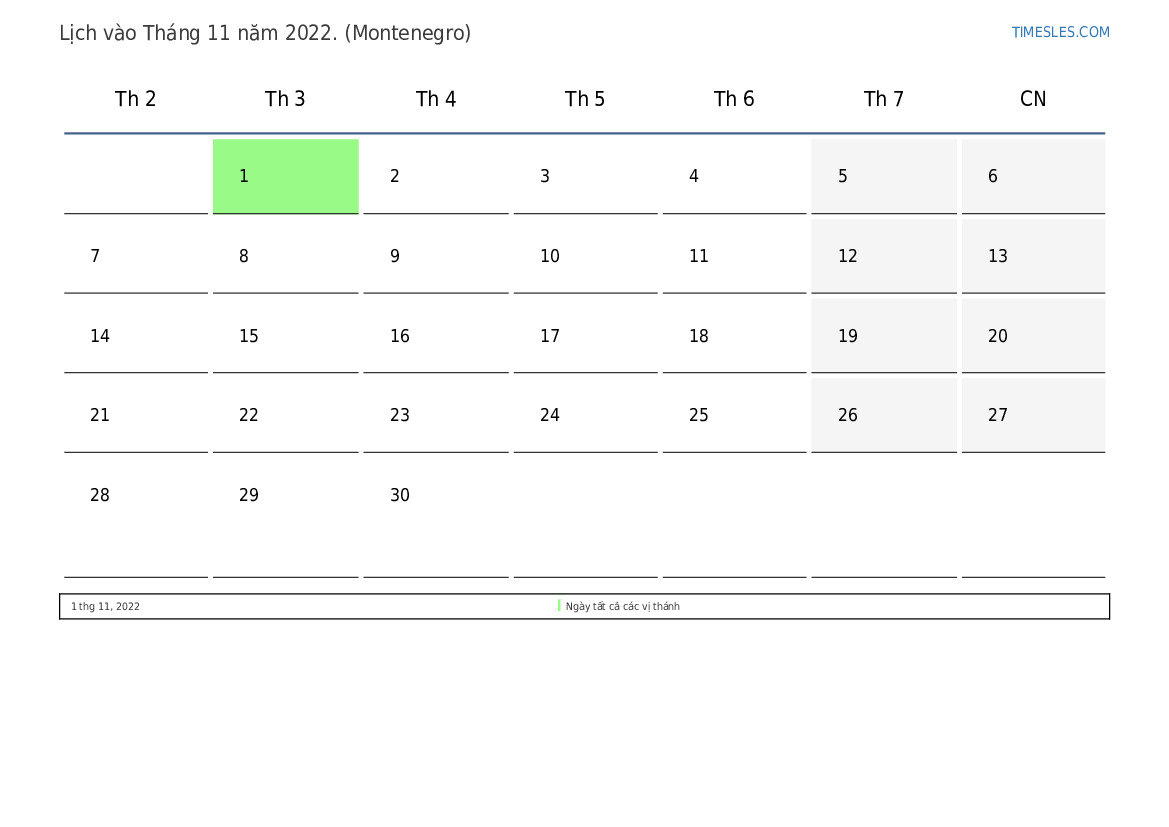 Tải xuống và in lịch PDF với các ngày lễ và cuối tuần vào Tháng 11 năm 2022 cho Montenegro