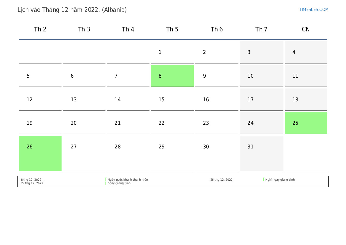 Lịch nghỉ lễ và cuối tuần vào Tháng 12 năm 2022 cho Albania