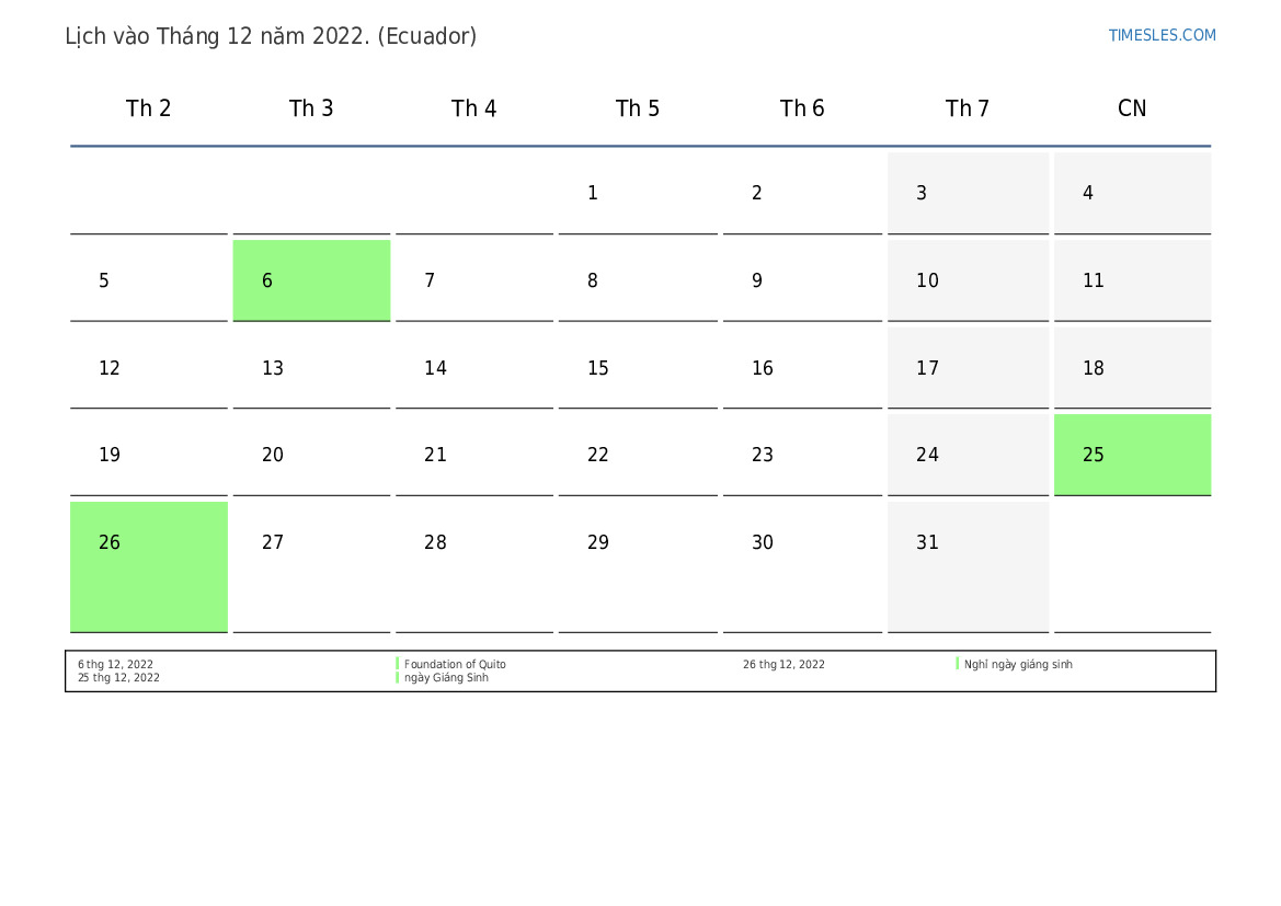 Lịch nghỉ lễ và cuối tuần vào Tháng 12 năm 2022 cho Ecuador
