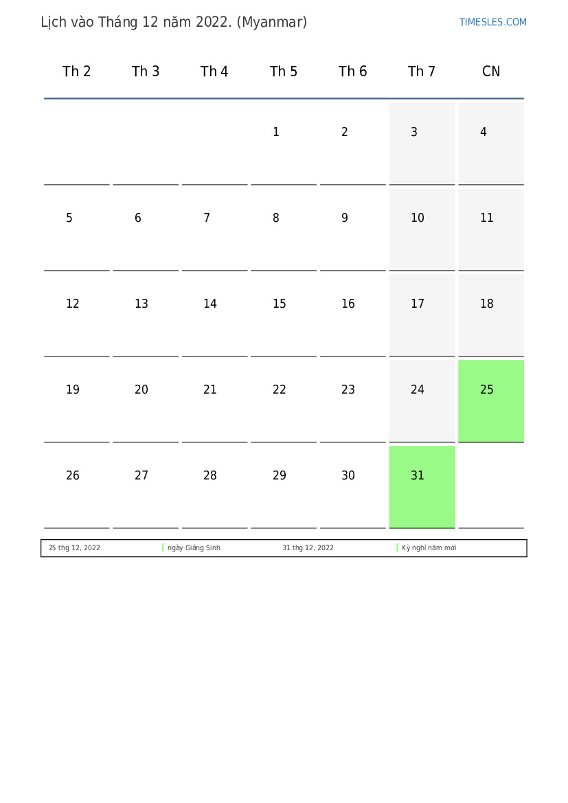 Tải xuống và in lịch PDF với các ngày lễ và cuối tuần vào Tháng 12 năm 2022 cho Myanmar