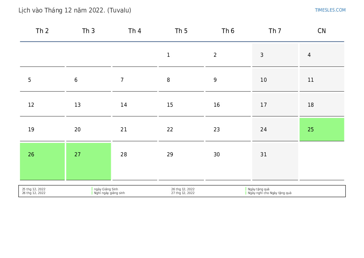 Lịch nghỉ lễ và cuối tuần vào Tháng 12 năm 2022 cho Tuvalu