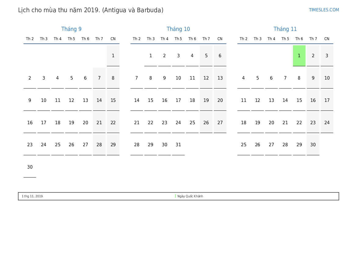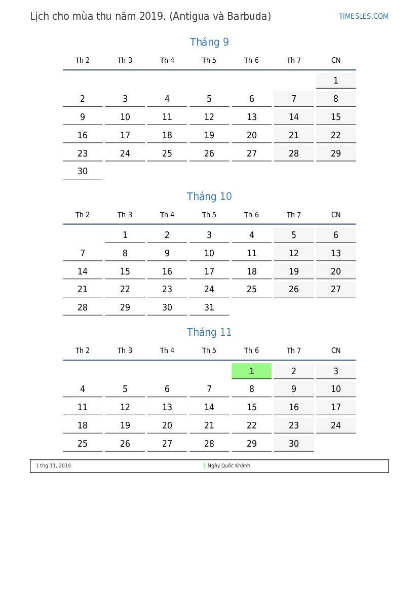 Tải xuống và in lịch PDF với các ngày lễ và cuối tuần cho mùa thu năm 2019 cho Antigua và Barbuda