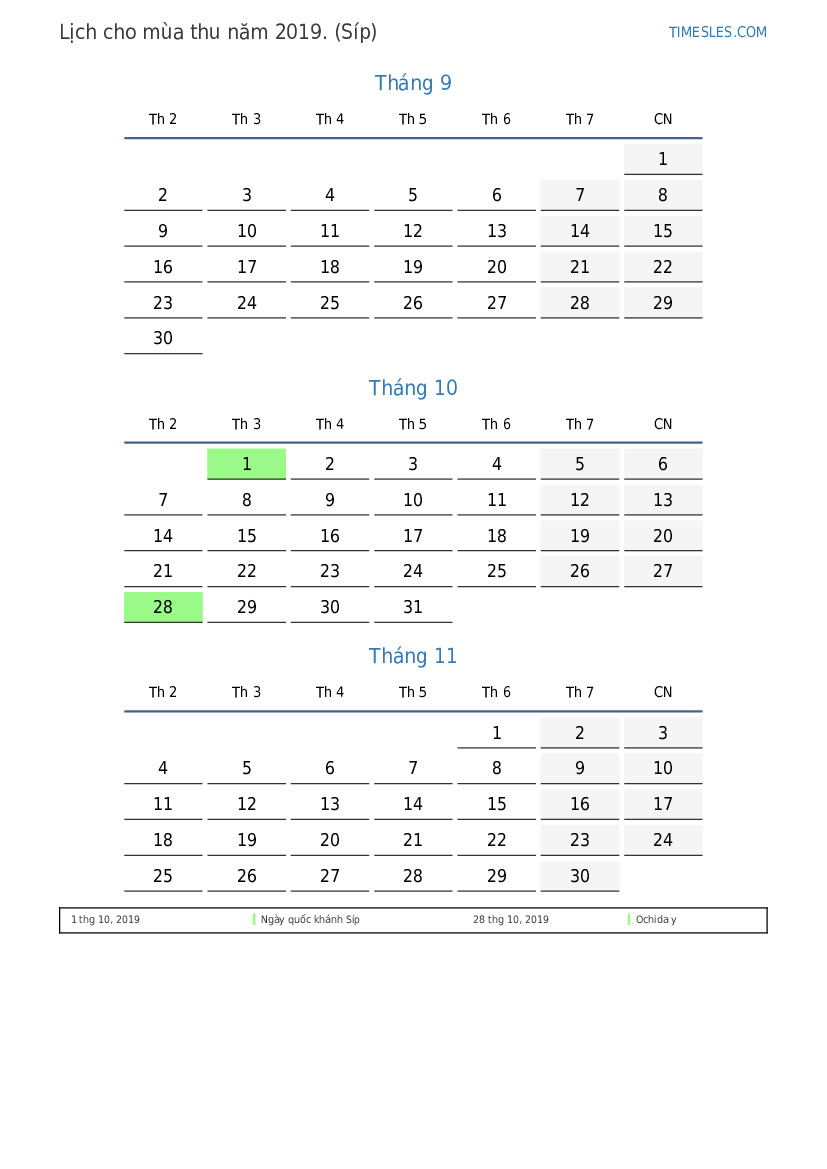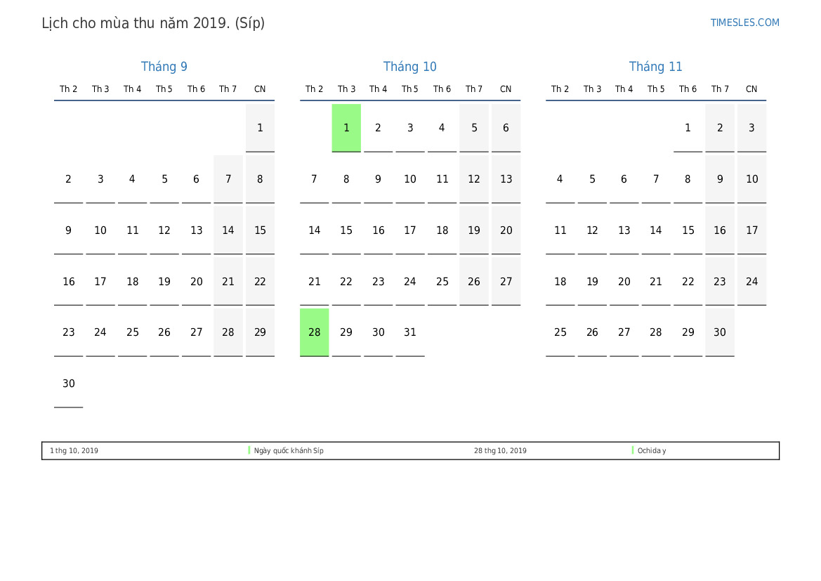 Tải xuống và in lịch PDF với các ngày lễ và cuối tuần cho mùa thu năm 2019 cho Síp