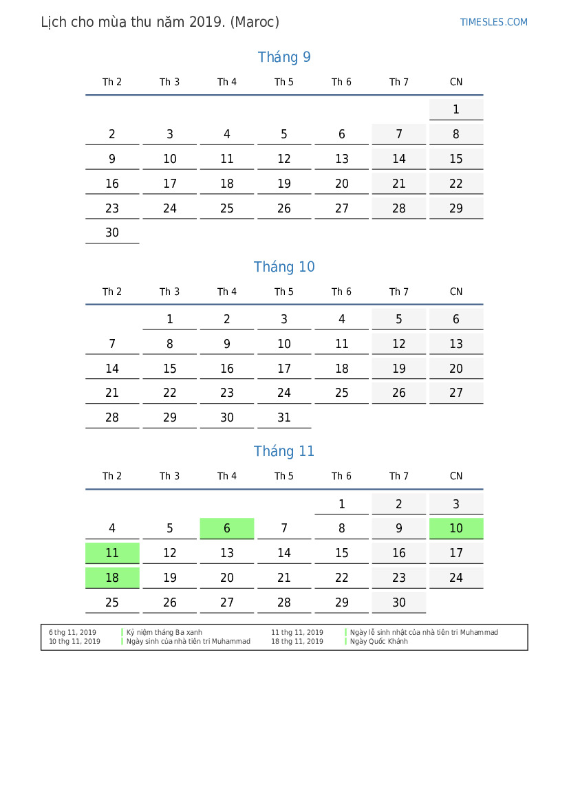 Lịch nghỉ lễ và cuối tuần cho mùa thu năm 2019 cho Maroc