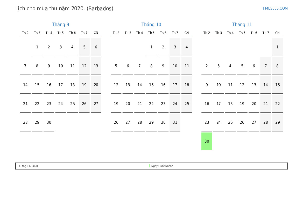 Tải xuống và in lịch PDF với các ngày lễ và cuối tuần cho mùa thu năm 2020 cho Barbados