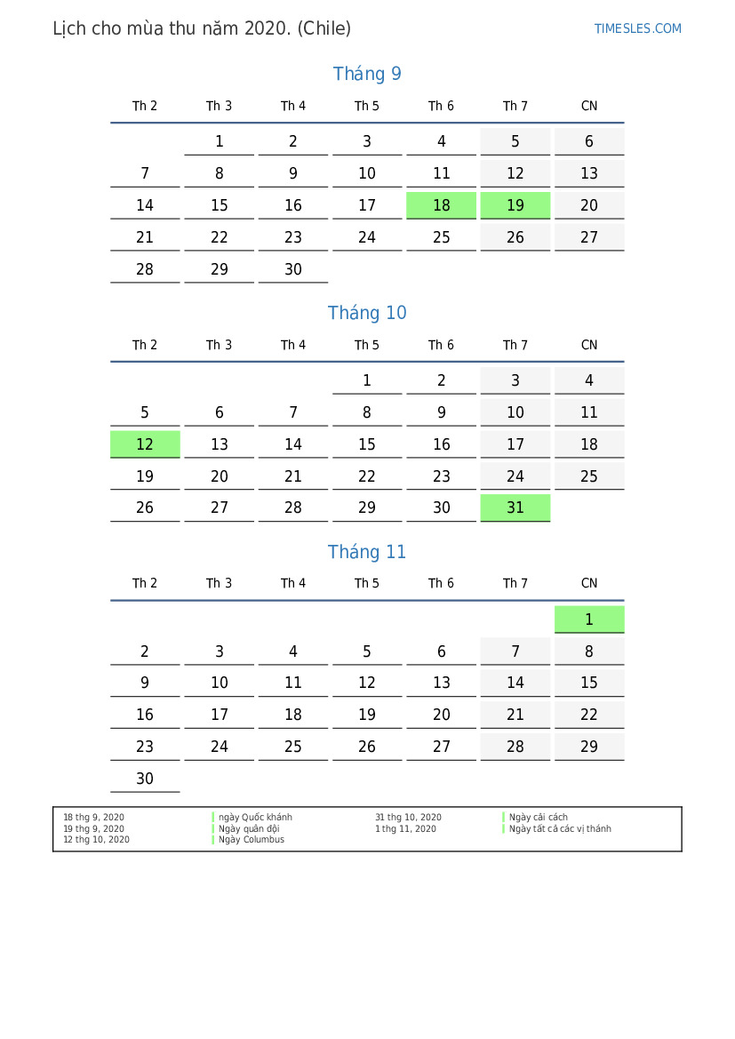 Vào mùa thu năm 2020, có 6 ngày nghỉ và ngày nghỉ trong nước chi Lê. Mùa thu năm 2020 bắt đầu vào thứ ba và kết thúc vào thứ hai.