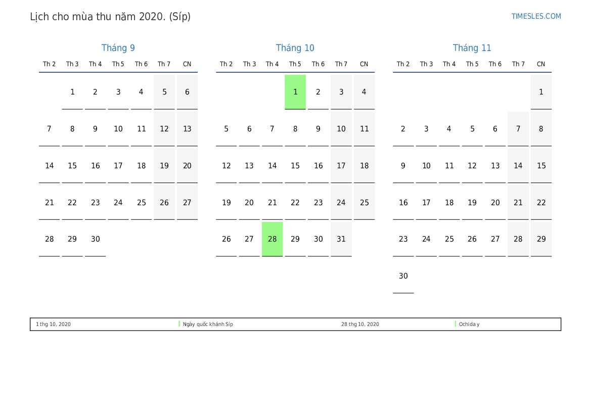 Tải xuống và in lịch PDF với các ngày lễ và cuối tuần cho mùa thu năm 2020 cho Síp