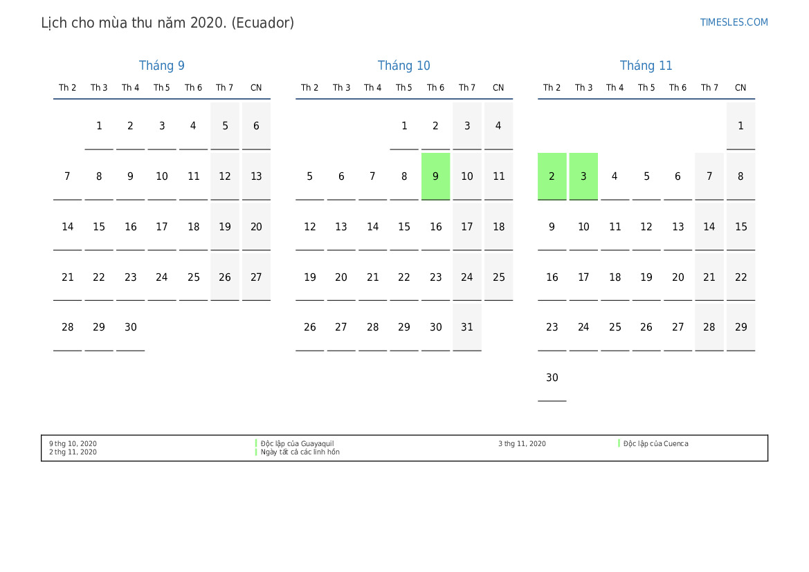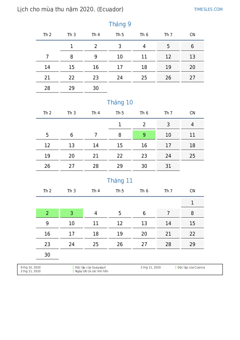 Tải xuống và in lịch PDF với các ngày lễ và cuối tuần cho mùa thu năm 2020 cho Ecuador