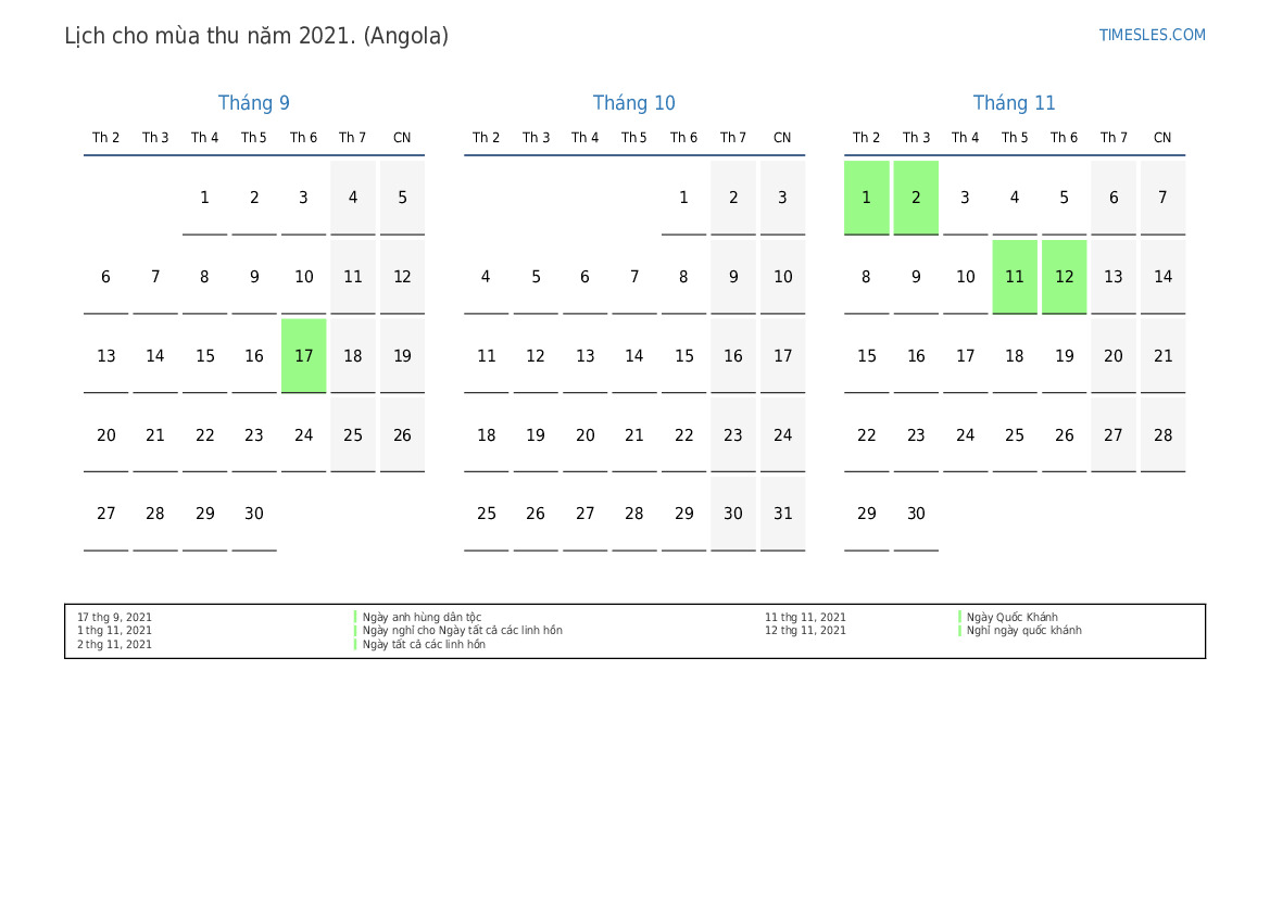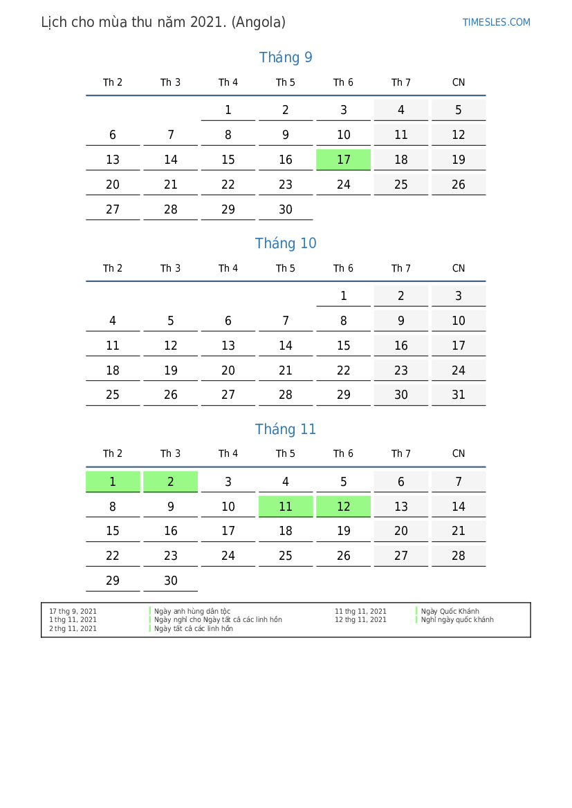 Tải xuống và in lịch PDF với các ngày lễ và cuối tuần cho mùa thu năm 2021 cho Angola