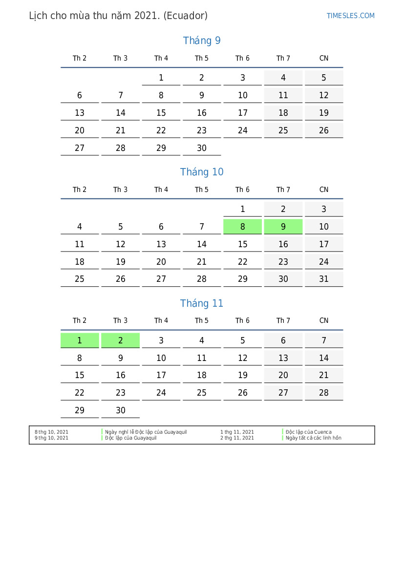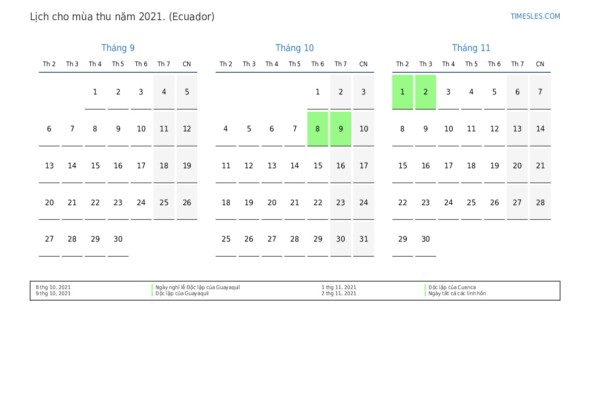 Tải xuống và in lịch PDF với các ngày lễ và cuối tuần cho mùa thu năm 2021 cho Ecuador