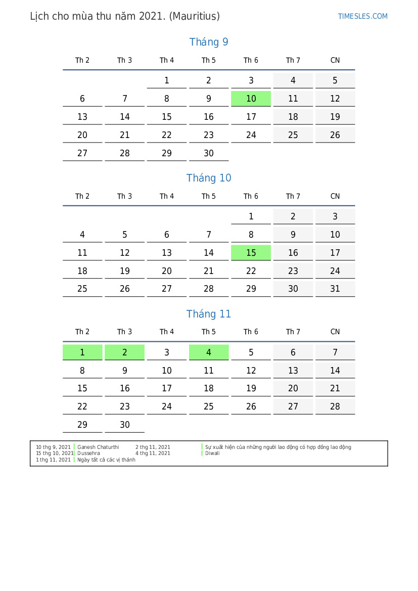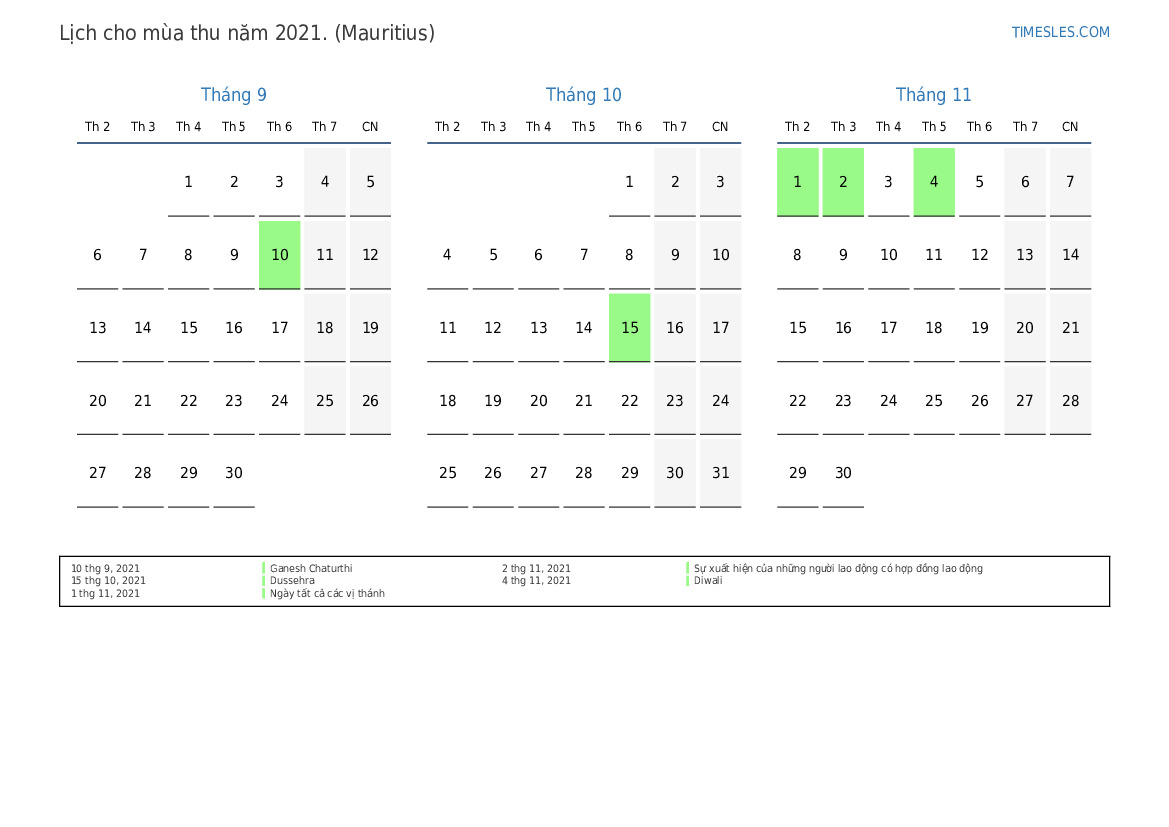 Lịch cho mùa thu năm 2021 cho Mauritius