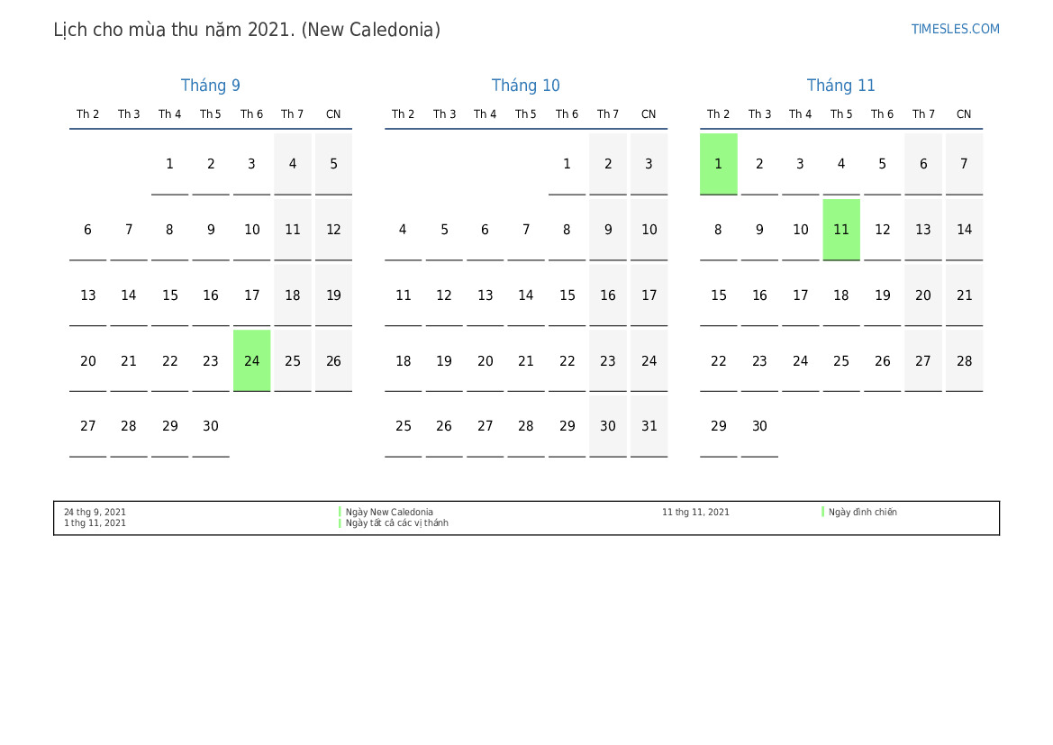 Tải xuống và in lịch PDF với các ngày lễ và cuối tuần cho mùa thu năm 2021 cho New Caledonia