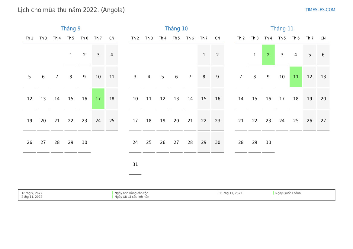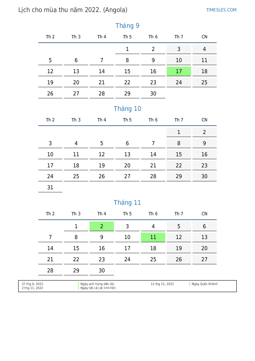 Tải xuống và in lịch PDF với các ngày lễ và cuối tuần cho mùa thu năm 2022 cho Angola