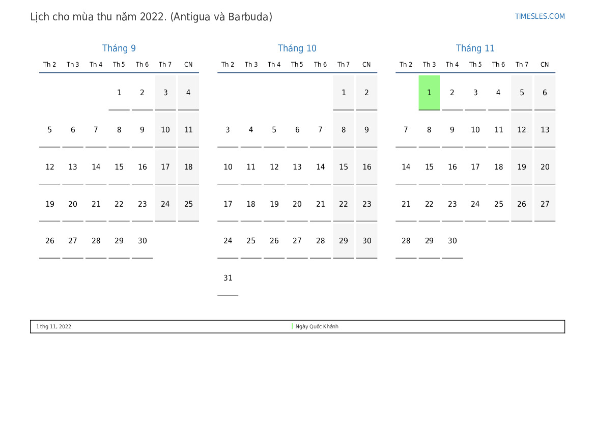 Tải xuống và in lịch PDF với các ngày lễ và cuối tuần cho mùa thu năm 2022 cho Antigua và Barbuda